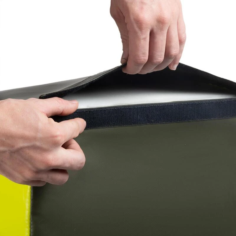 Le bouclier de percussion possède 2 anses sur la face arrière et un renfort sur le haut de la face avant. Pour plus de confort, nous avons choisi une bande scratch plutôt qu’une fermeture Eclair.