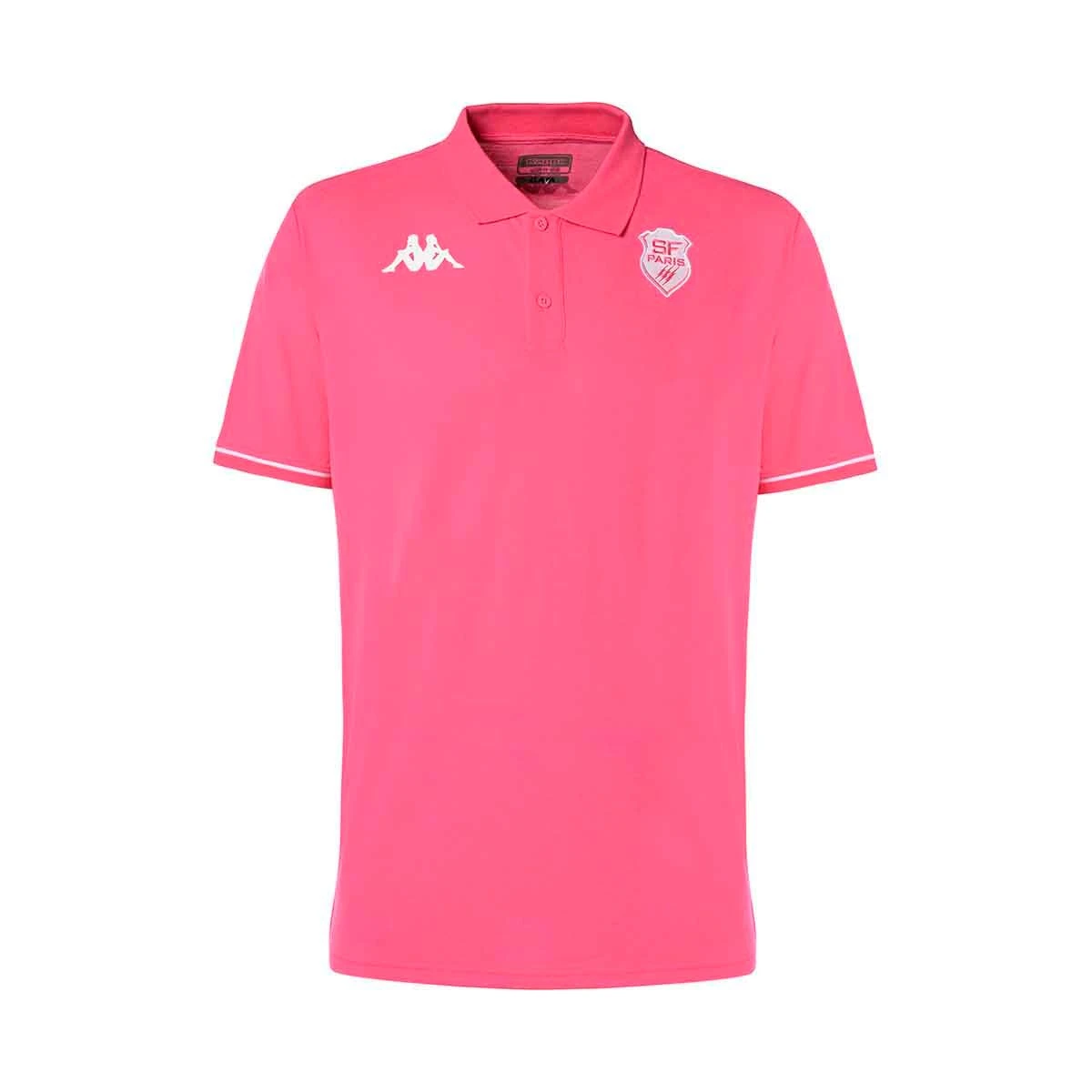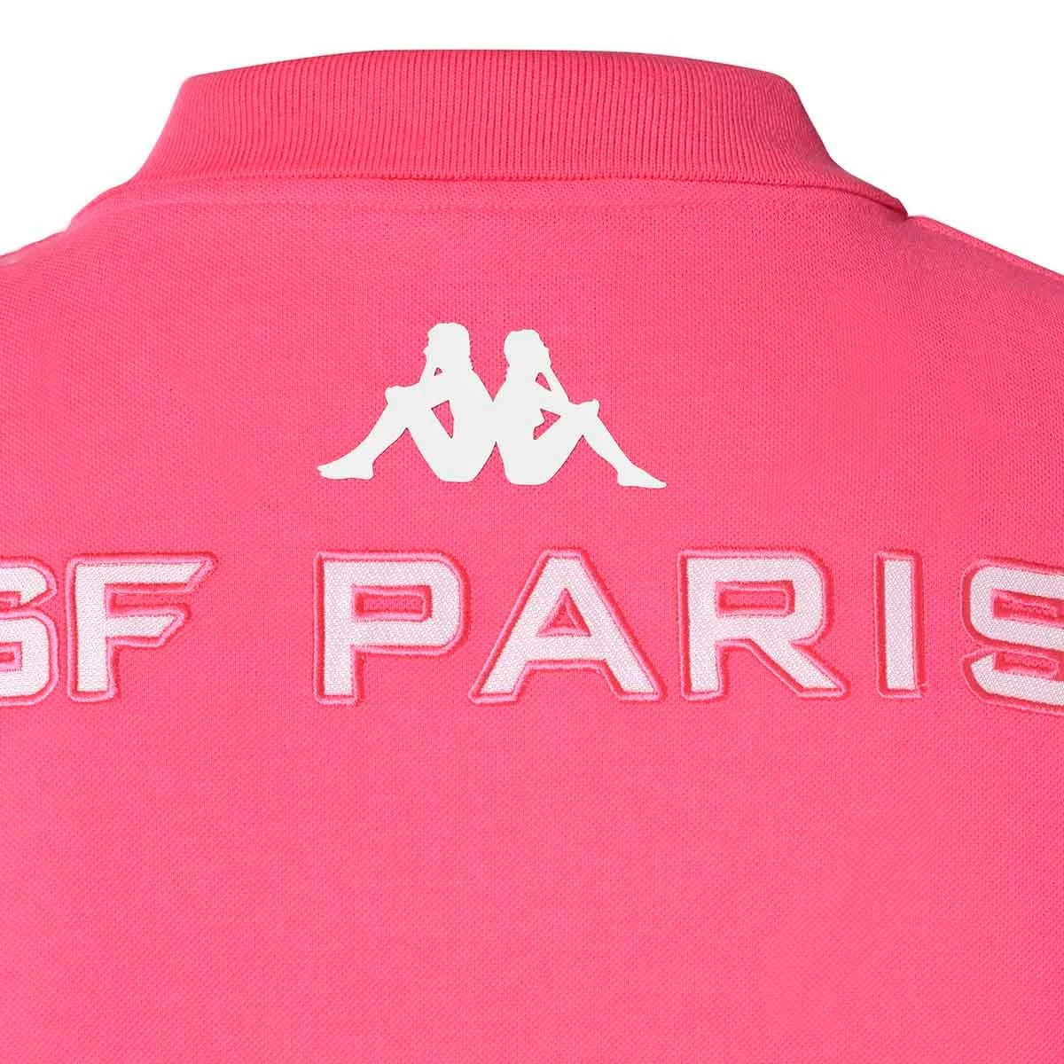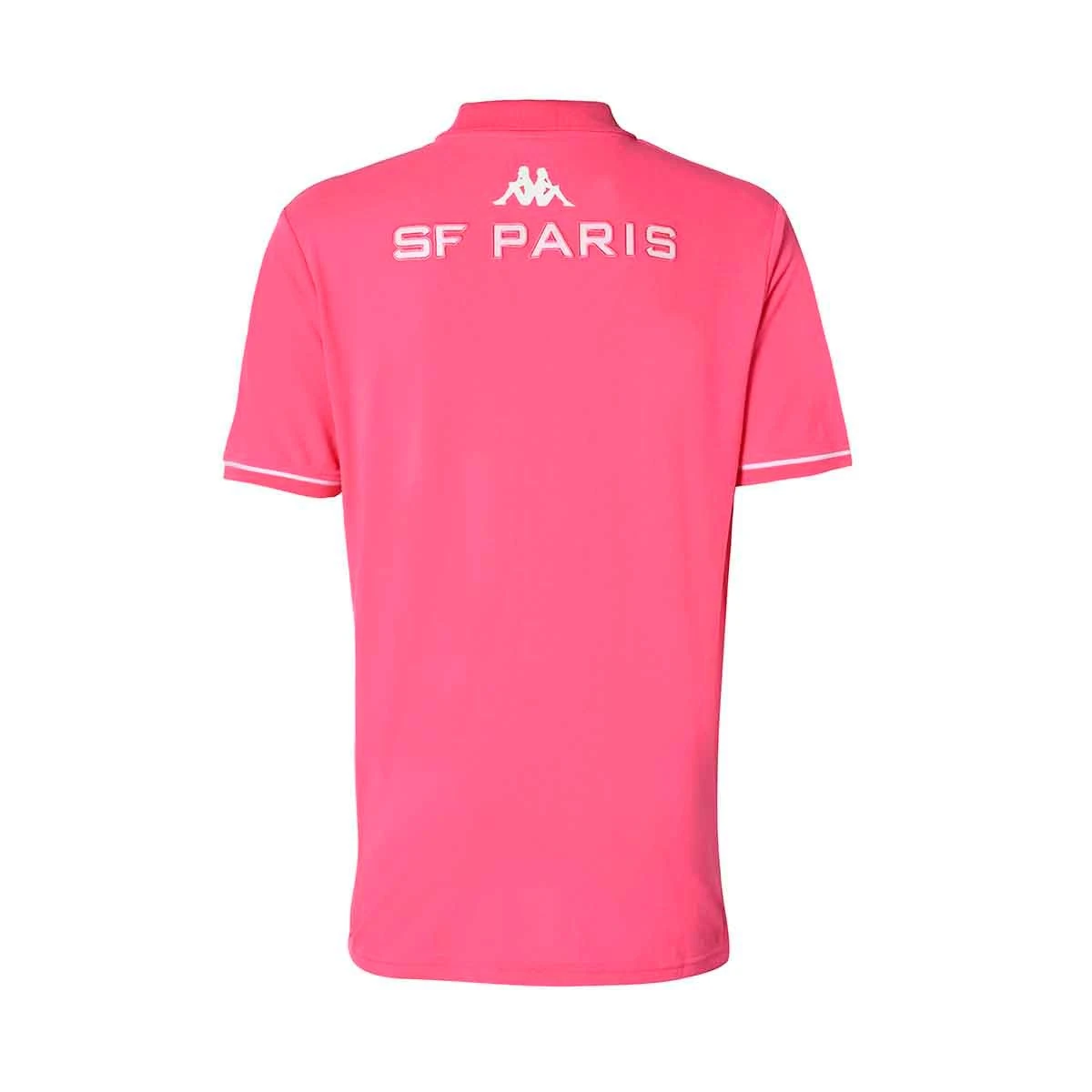 Logo Kappa sur le devant et dans le dos en impression haute densité. Logo du SFP en gabardine sur le devant côté cœur et lettrage SF PARIS en gabardine dans le dos appliqué avec emby.